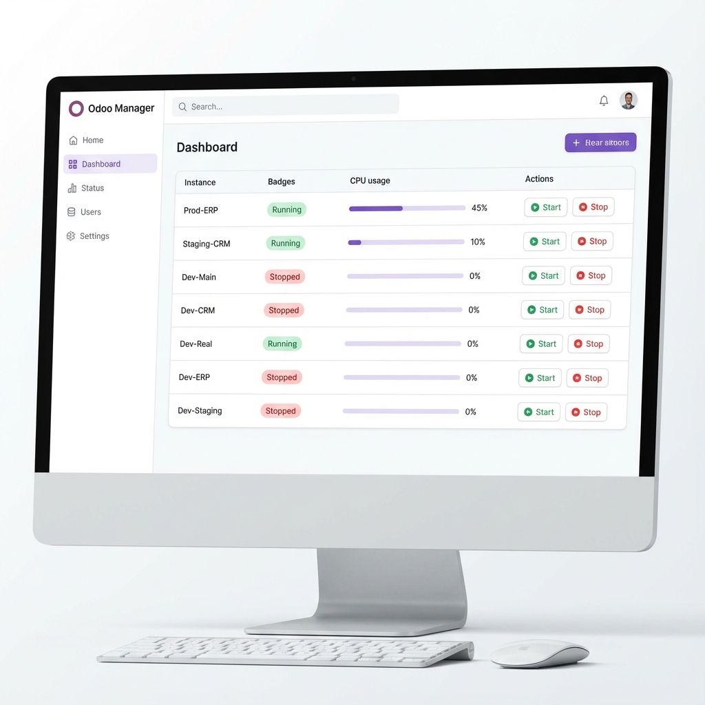 Your command center for Odoo. View all your instances, check their status, and perform quick actions like start, stop, or restart—all from one intuitive interface.